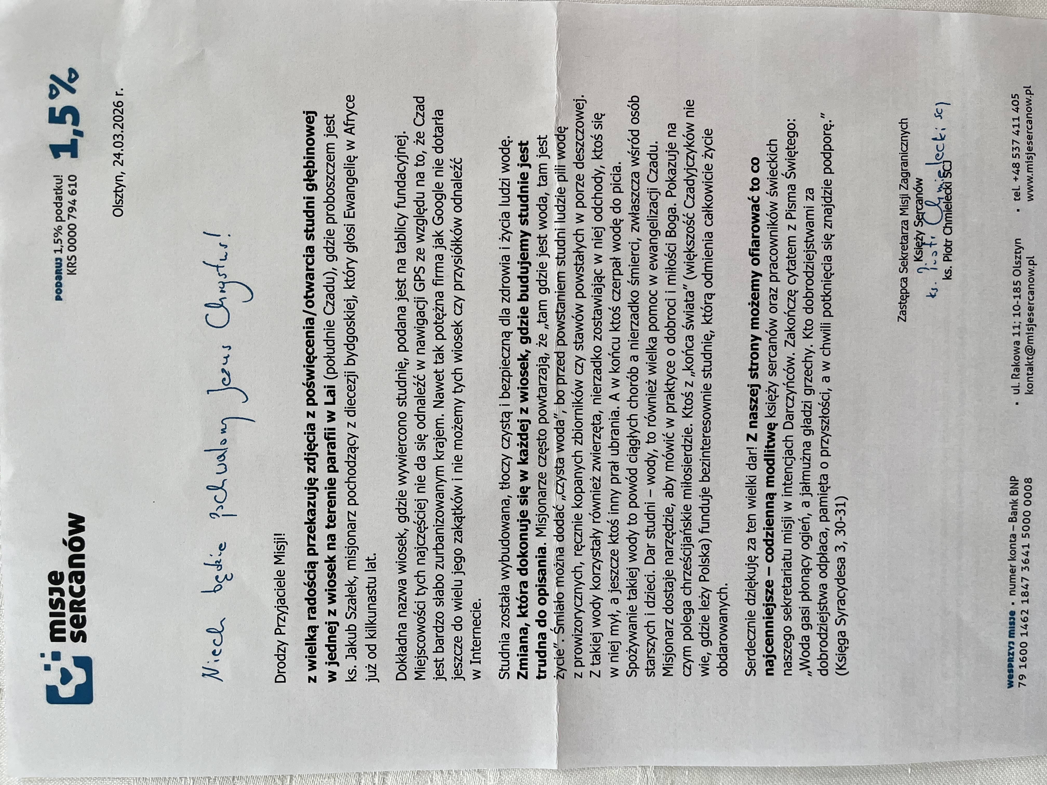 Z radością informujemy, że nasza wspólnota parafialna włączyła się w dzieło misyjne prowadzone przez polskich misjonarzy w Czadzie. W ramach tej inicjatywy wsparliśmy budowę studni, która zapewnia mieszkańcom – podopiecznym misjonarzy – dostęp do czystej i zdrowej wody. Koszt wybudowania jednej studni wyniósł 15 000 zł. W bardzo szybkim czasie parafianie odpowiedzieli na zaproszenie do włączenia się w to dzieło. W ciągu dwóch tygodni zebraliśmy potrzebną kwotę.