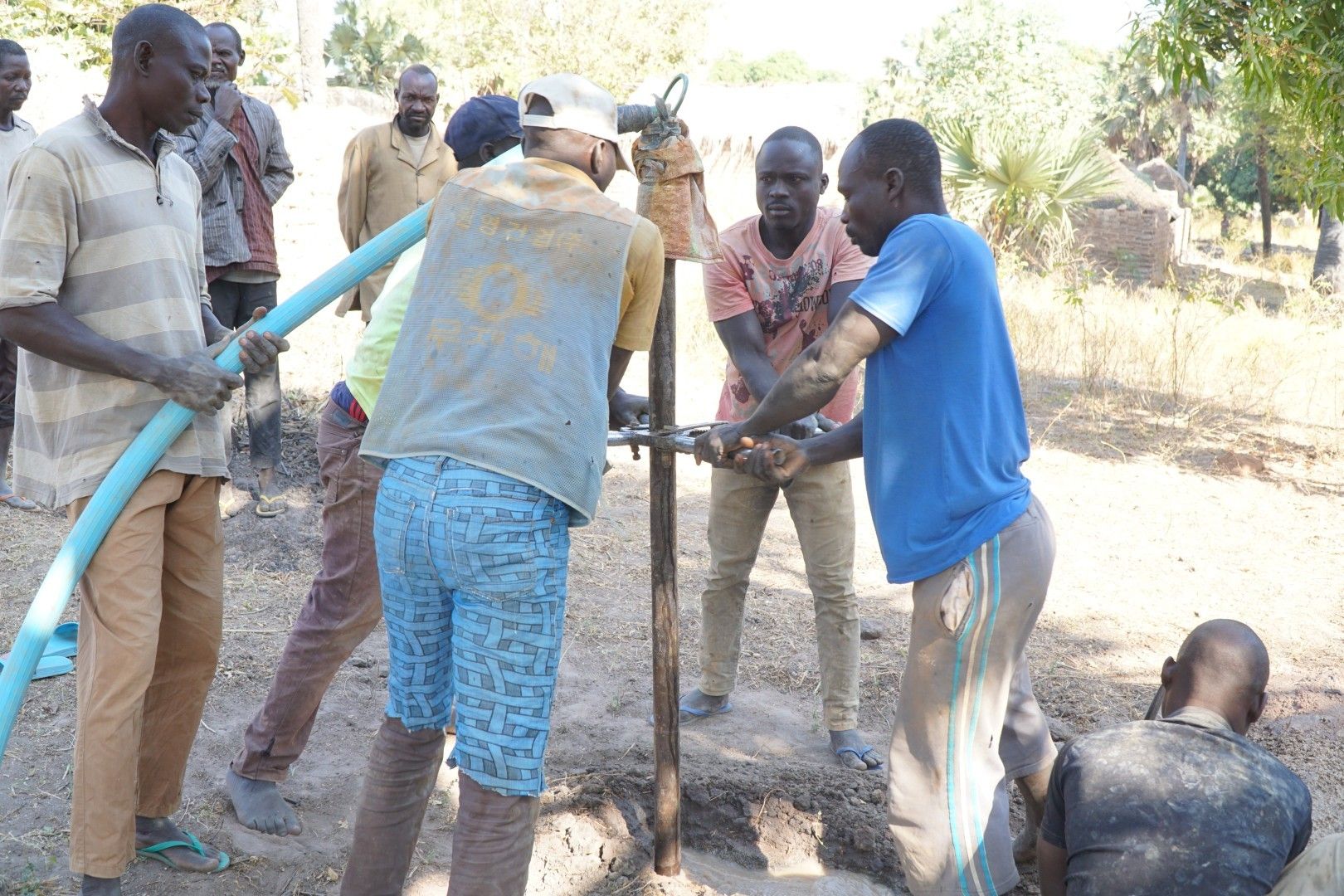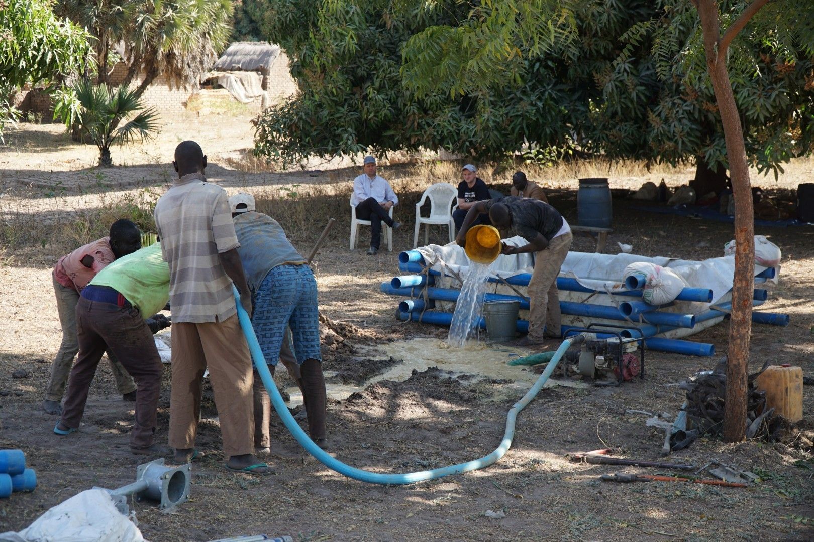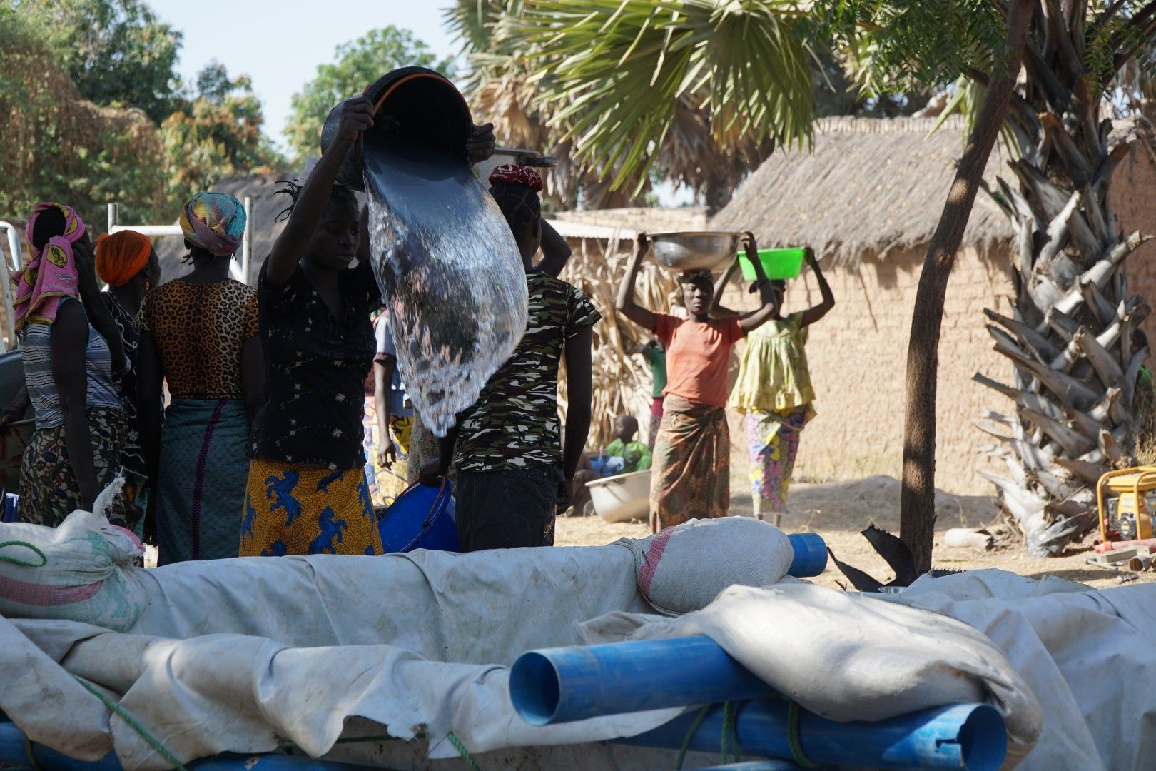 Można powiedzieć, że w fazie przygotowania do odwiertu najważniejszą robotę wykonywały właśnie kobiety noszące wodę. Najpierw budowlańcy budują basen-pojemnik, który trzeba wypełnić wodą konieczną do tego, żeby zacząć wiercić. Woda zmagazynowana w taki sposób jest wtłaczana w rurę „wiercącą”, aby wypłukiwać materiał przez które przebija się wiertło. Odwiert jest robiony ręcznie, a z robotnikami współpracuje tylko mechaniczna pompa tłocząca wodę. Niestety nie wystarczy jedno napełnienie takiego basenu – wodę trzeba donosić na bieżąco, bo jej zużycie jest duże. W godzinach popołudniowych, po kilku godzinach wiercenia, kiedy ciągle nie było efektu, wodę zaczęli nosić już nawet mężczyźni i dzieci.