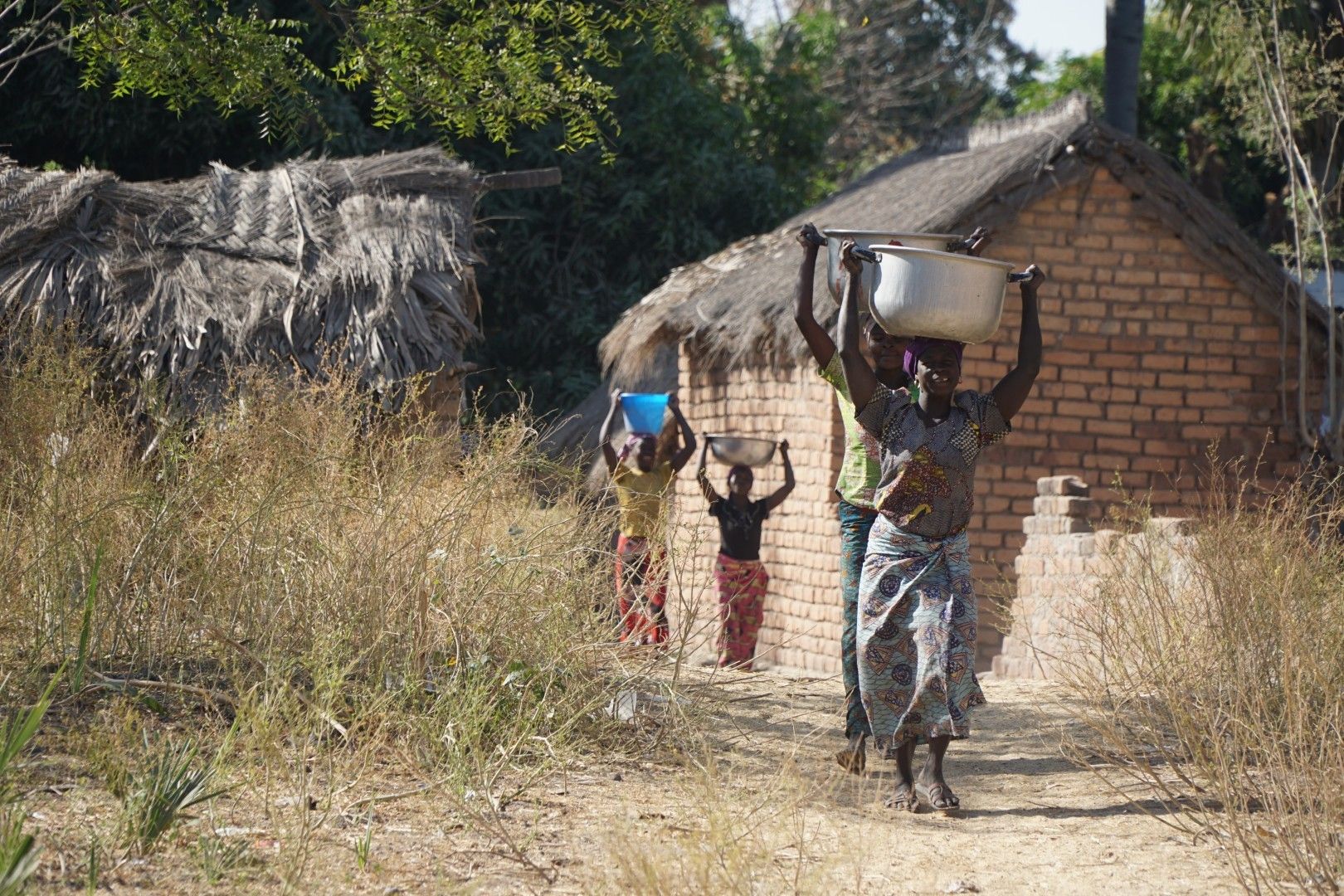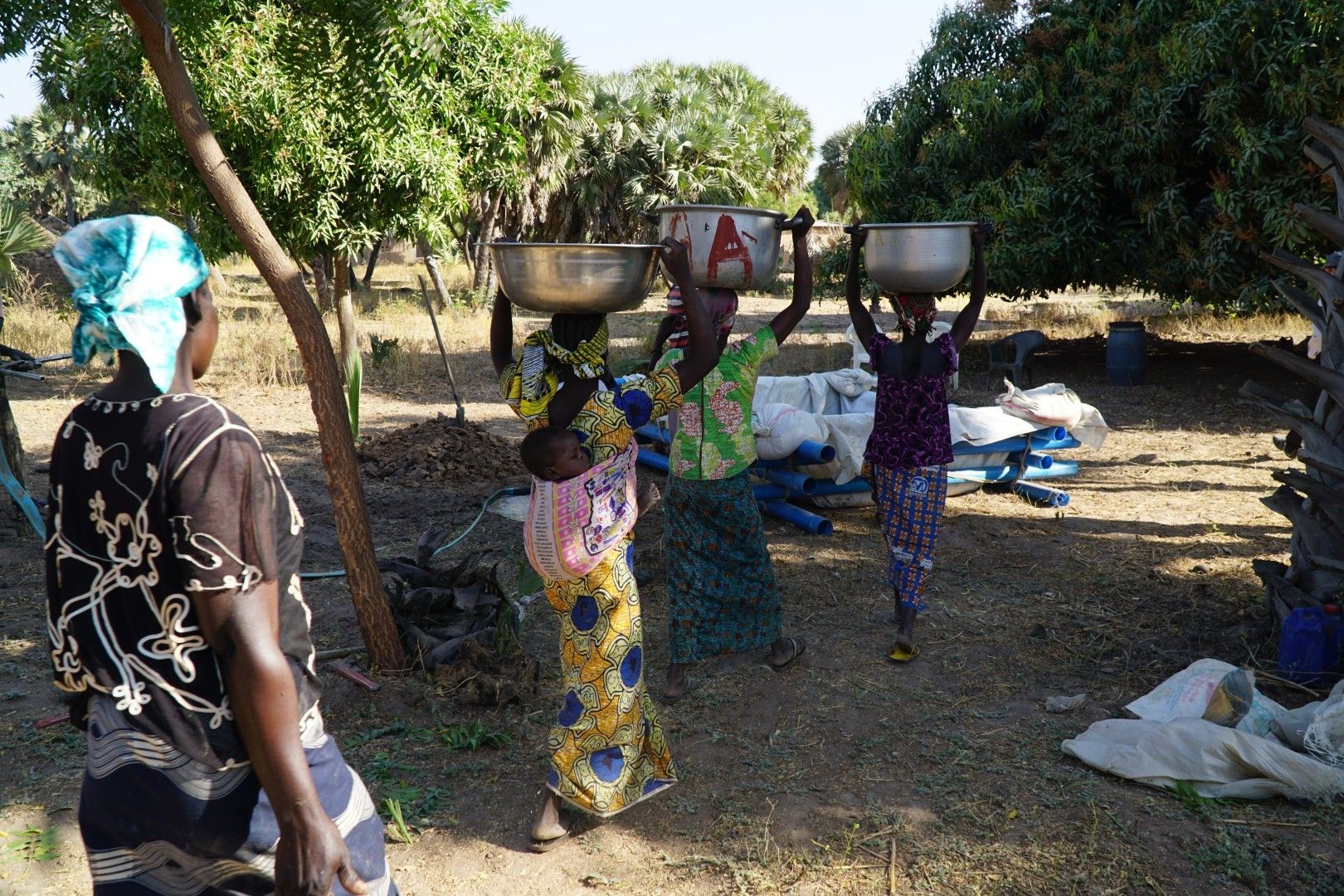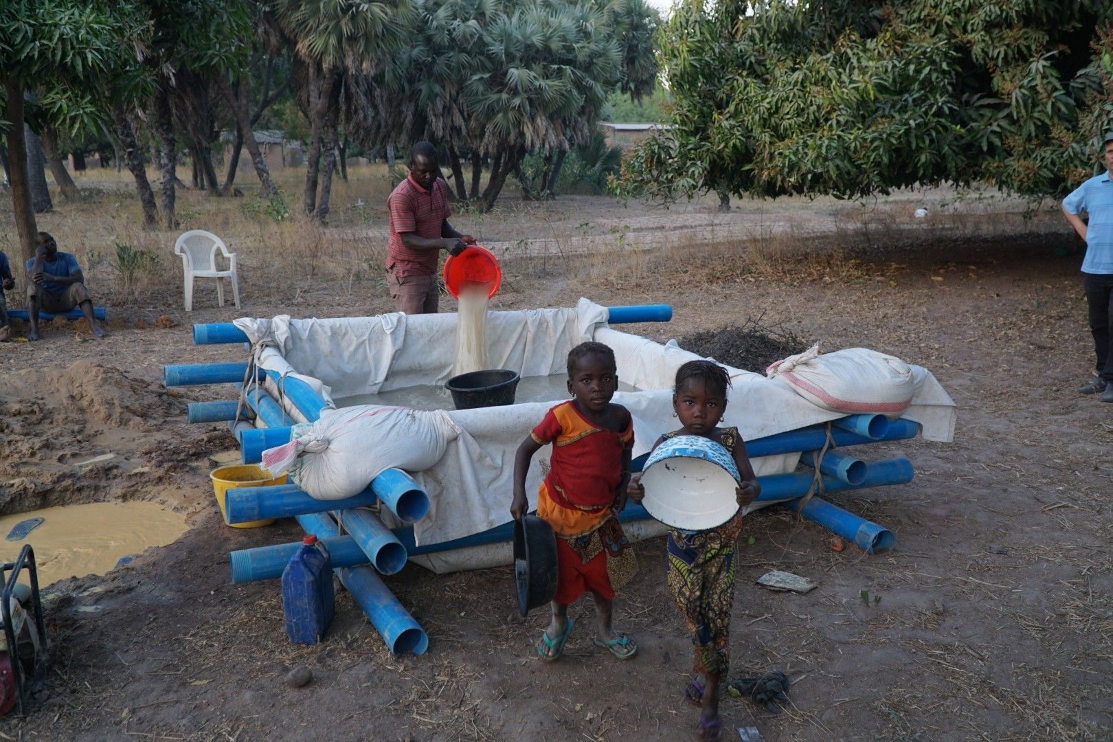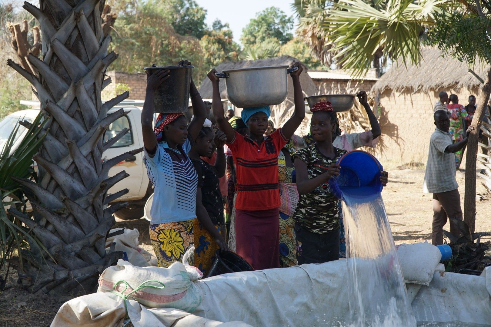 Można powiedzieć, że w fazie przygotowania do odwiertu najważniejszą robotę wykonywały właśnie kobiety noszące wodę. Najpierw budowlańcy budują basen-pojemnik, który trzeba wypełnić wodą konieczną do tego, żeby zacząć wiercić. Woda zmagazynowana w taki sposób jest wtłaczana w rurę „wiercącą”, aby wypłukiwać materiał przez które przebija się wiertło. Odwiert jest robiony ręcznie, a z robotnikami współpracuje tylko mechaniczna pompa tłocząca wodę. Niestety nie wystarczy jedno napełnienie takiego basenu – wodę trzeba donosić na bieżąco, bo jej zużycie jest duże. W godzinach popołudniowych, po kilku godzinach wiercenia, kiedy ciągle nie było efektu, wodę zaczęli nosić już nawet mężczyźni i dzieci.